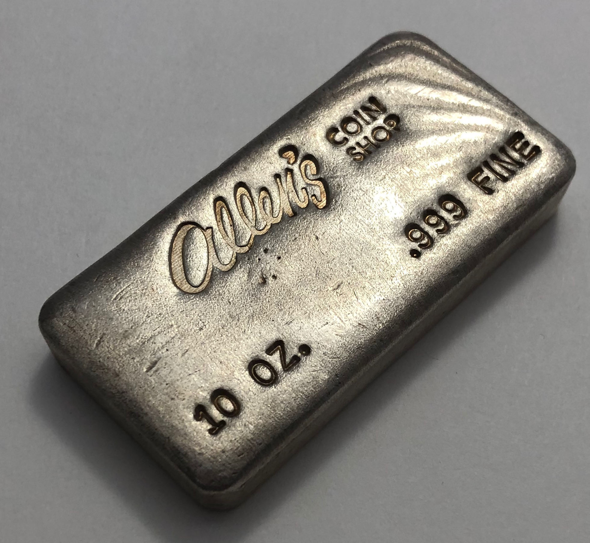 Company Information: Still an existing coin shop in Westerville. There are two versions of the ten ounce bar: one with FINE and one with SILVER stamped in the lower right.