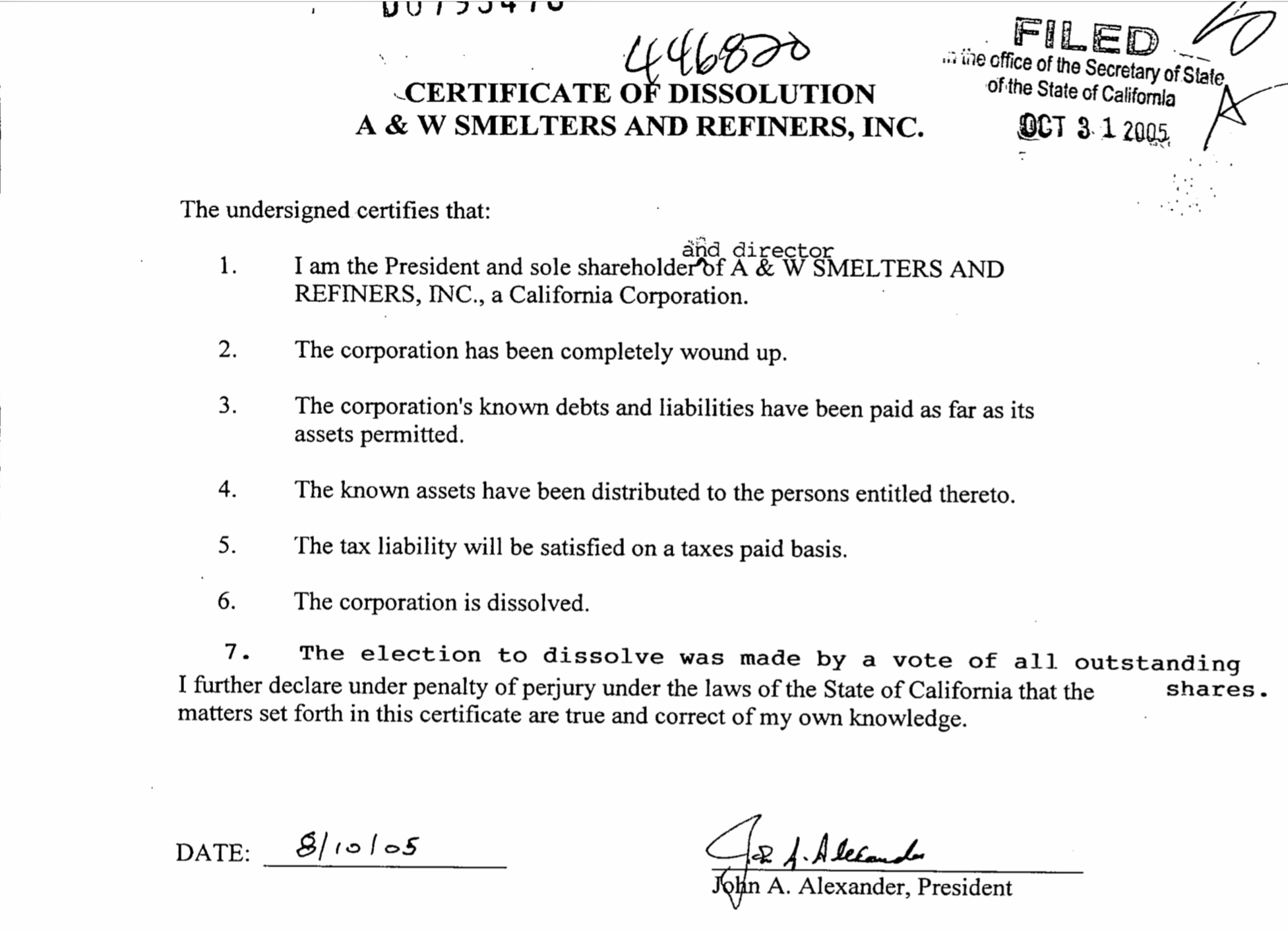 Company Name: A & W Smelters and Refiners. Commonly referred to as Alexander Westerfall but the “A” and “W” were Alexander and Westerfeld, two presidents of the company.