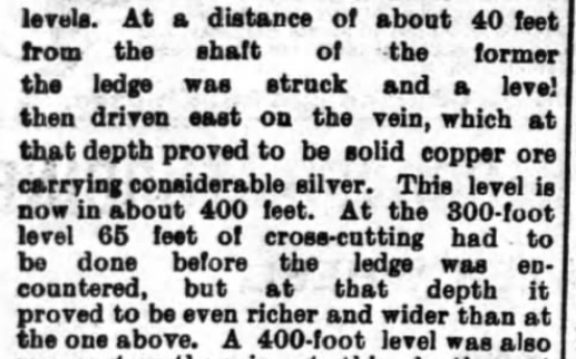 The above article goes on to describe the Harris-Lloyd tunnel, one of the mines owned by the Boston & Montana. At the 400 foot level the vein “proved to be solid copper ore carrying considerable silver”, and after cross-cutting it was even richer and wider at a shallower depth: