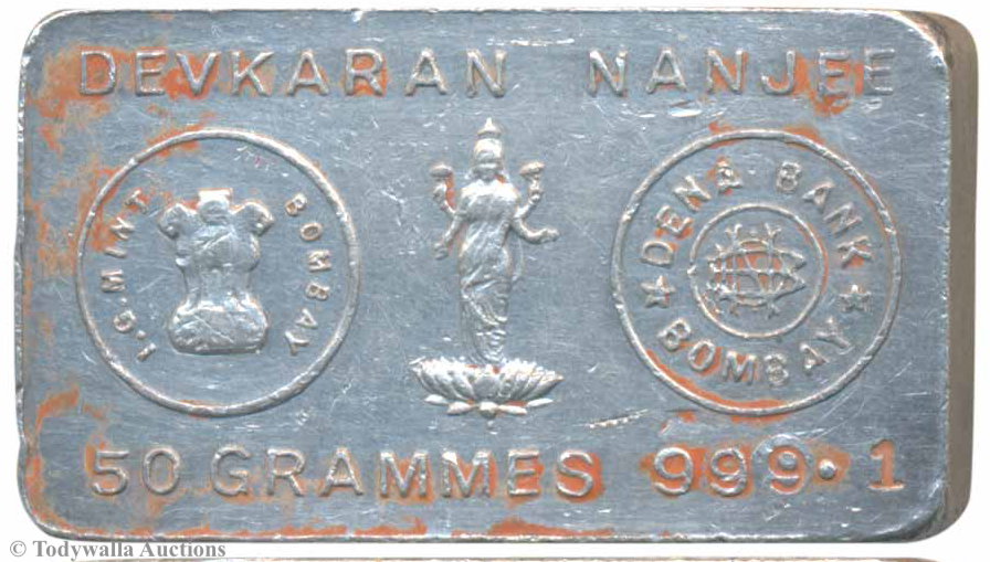 After India's independence in 1947, His Majesty's Mint became India Government Mint (I.G. Mint) so the 5, 10, and 20 Tolas with the I.G. Mint's State Emblem of India and Dena Bank's DNB monogram were probably produced after this year.