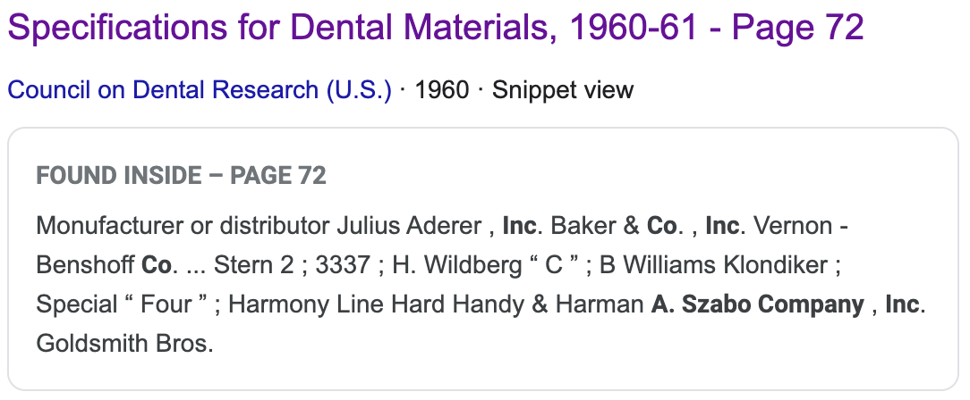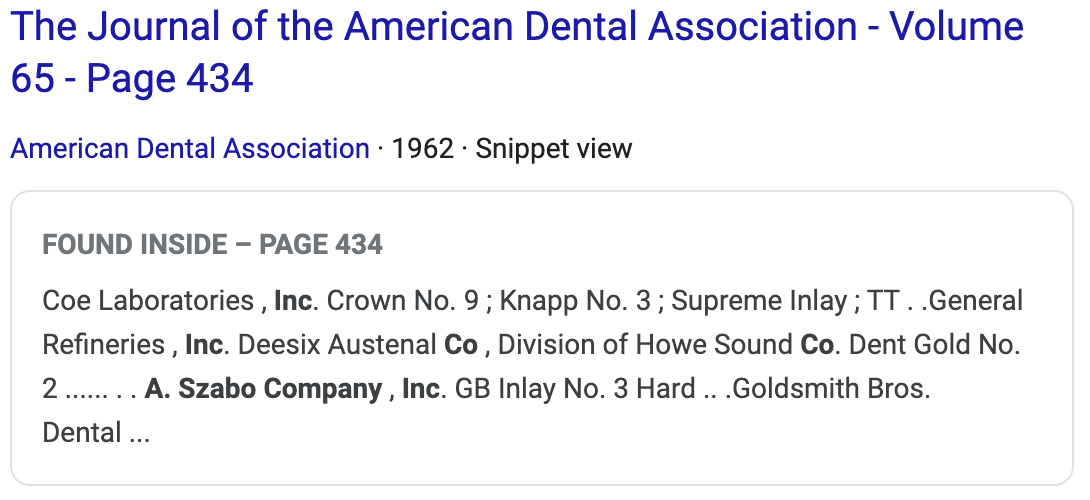 In later years, A. Szabo Company was incorporated as A. Szabo Company, Inc.. Although the exact year of incorporation is unknown, there are records of this name in the Specifications for Dental Materials in 1960 and The Journal of the American Dental Association in 1962 published by the American Dental Association. So this company was incorporated at least by 1960.