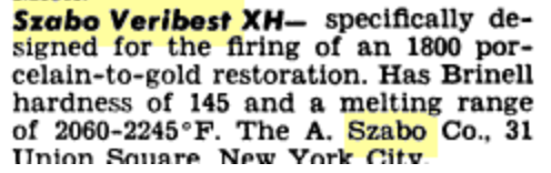 Although the exact year of establishment is not known, A. Szabo Company was formed in New York whose main business is casting gold for partial dentures. Following are a couple of listings from the Index of Trademarks Issued from the United States Patent Office published in 1946 by U.S. Government Printing Office.
