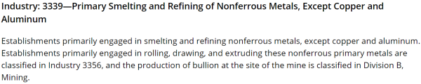 SIC (Standard Industrial Classification) 3339 is defined by NAICS (North American Industry Classification System) for Primary Smelting and Refining of Nonferrous Metals, Except Copper and Aluminum.