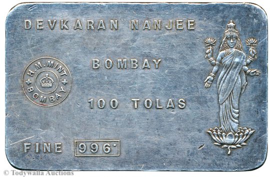 A note on possible years of production: The 5, 10, and 20 Tolas bars by His Majesty's Mint (H.M. Mint), Bombay with the crown logo and Dena Bank's Goddess Lakshmi logo were most probably produced between 1938 and 1947, 1938 being the year in which this bank was established and 1947 is the year when H.M. Mint was renamed.