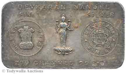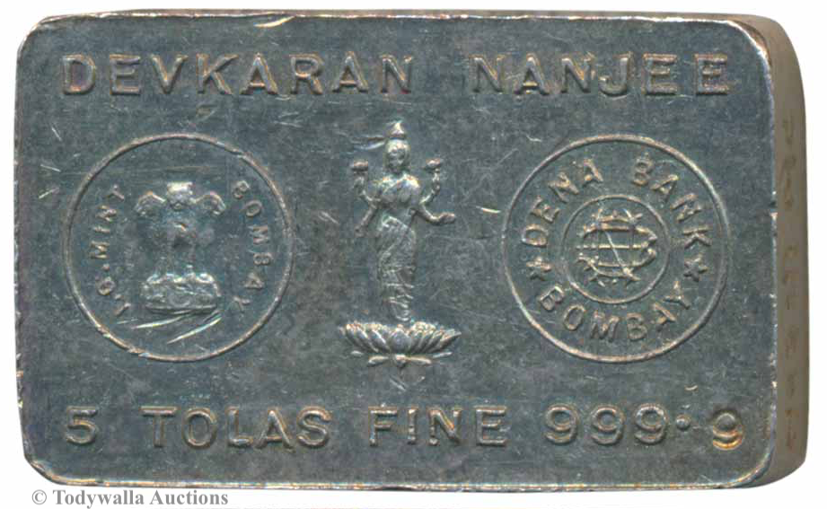 After India's independence in 1947, His Majesty's Mint became India Government Mint (I.G. Mint) so the 5, 10, and 20 Tolas with the I.G. Mint's State Emblem of India and Dena Bank's DNB monogram were probably produced after this year.