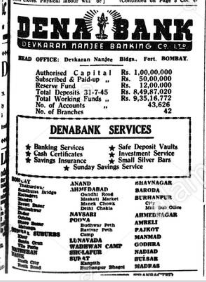 Here's an advertisement of Dena bank in The Bombay Chronicle on August 30, 1945. Logo of Dena Bank, Goddess Lakshmi - the Goddess of wealth can be seen at the top.
