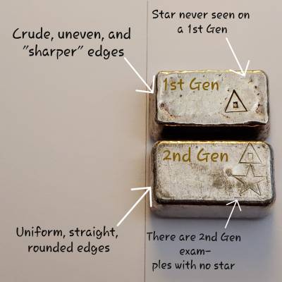 This general 1st and 2nd Generation classification holds true for the vast majority of poured 3oz Foster ingots, but there are rare and notable exceptions. This will be built out at a later time, but here is a preview: