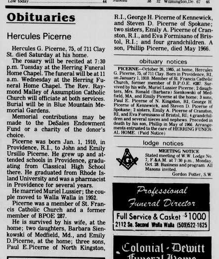 Hercules G. Picerne was born in January 1910 and died in October 1985. He lived the first half his life in Rhode Island and lived in Walla Walla, WA from approximately 1960 to 1985. He was married in 1966.