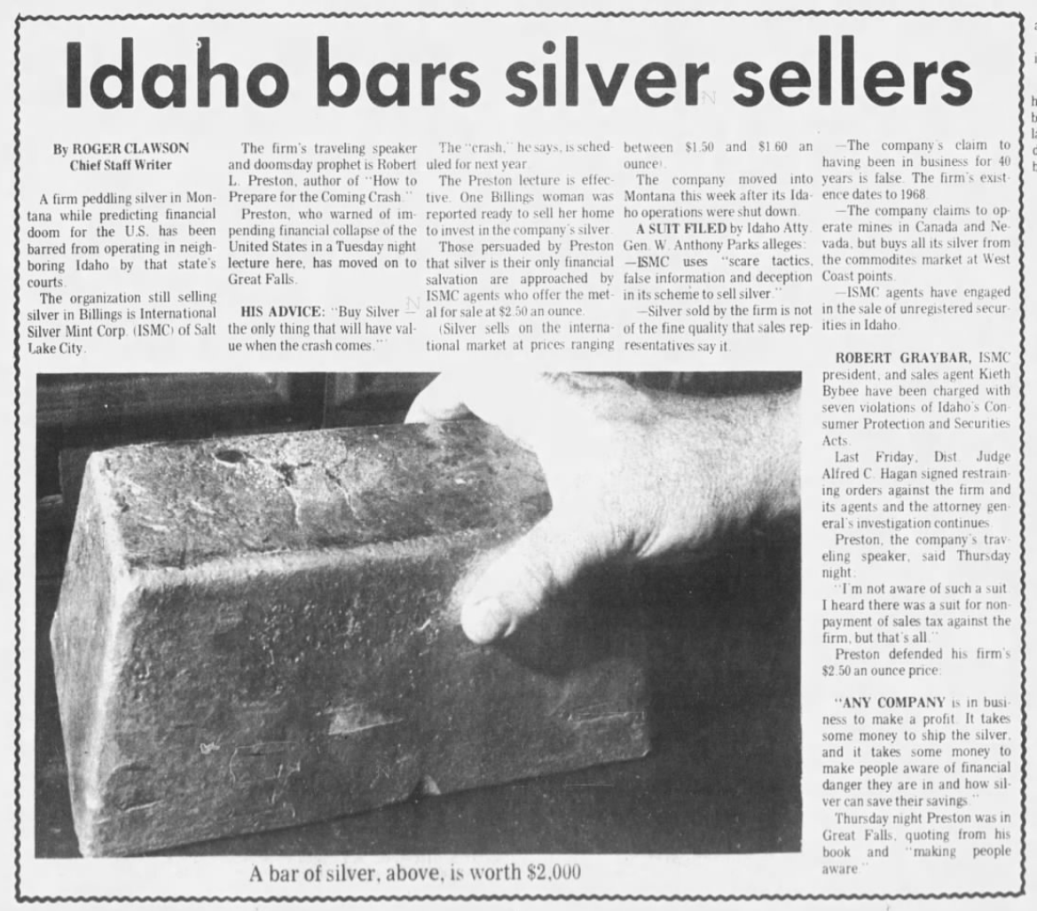 International Silver Mint Corporation ran several advertisements in 1972. From the Daily Herald, Provo, Utah from January 23, 1972: