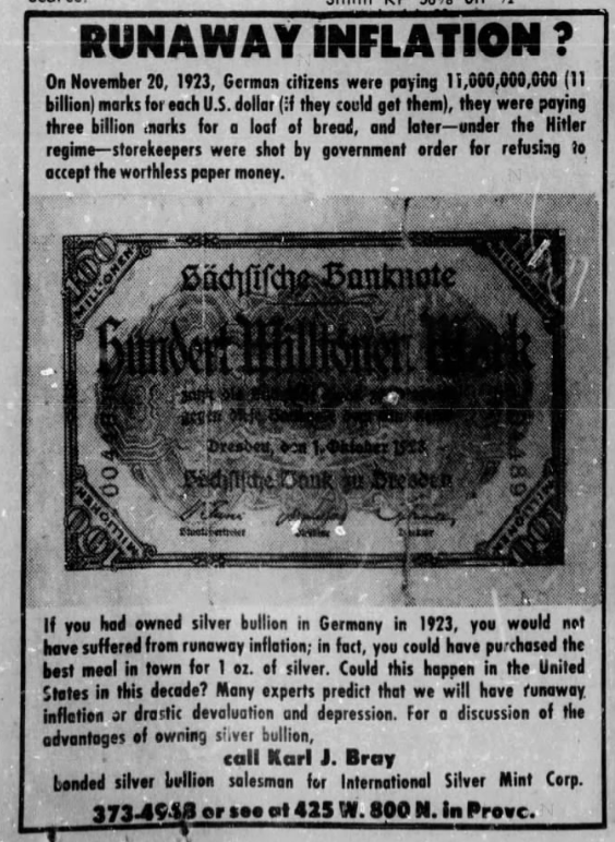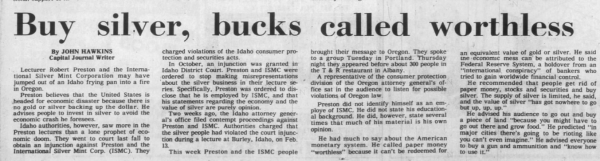 They also sponsored various presentations and sales events hosted by Robert Preston, a doom and gloom author. This example is from the Odgen Standard-Examiner on March 19, 1972: