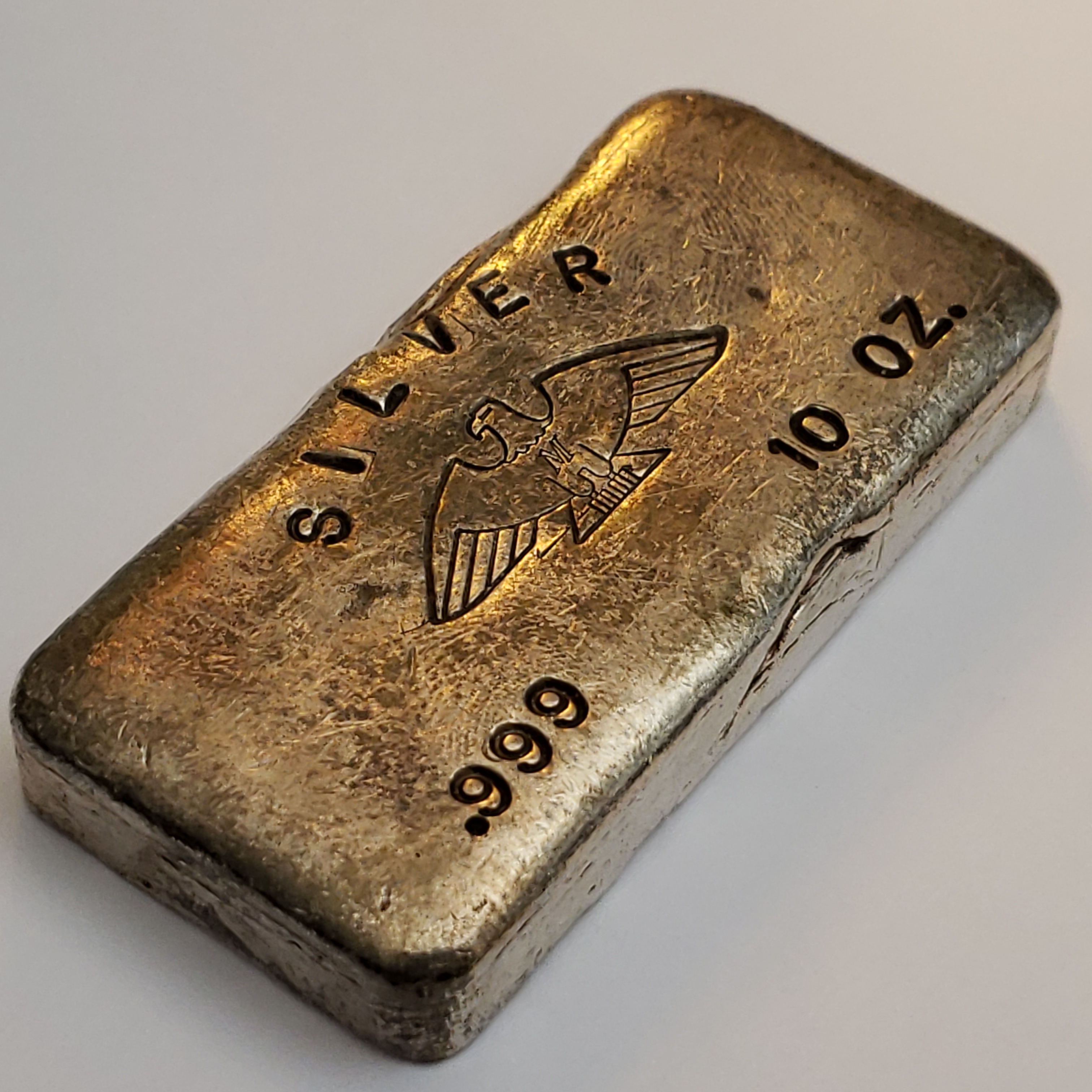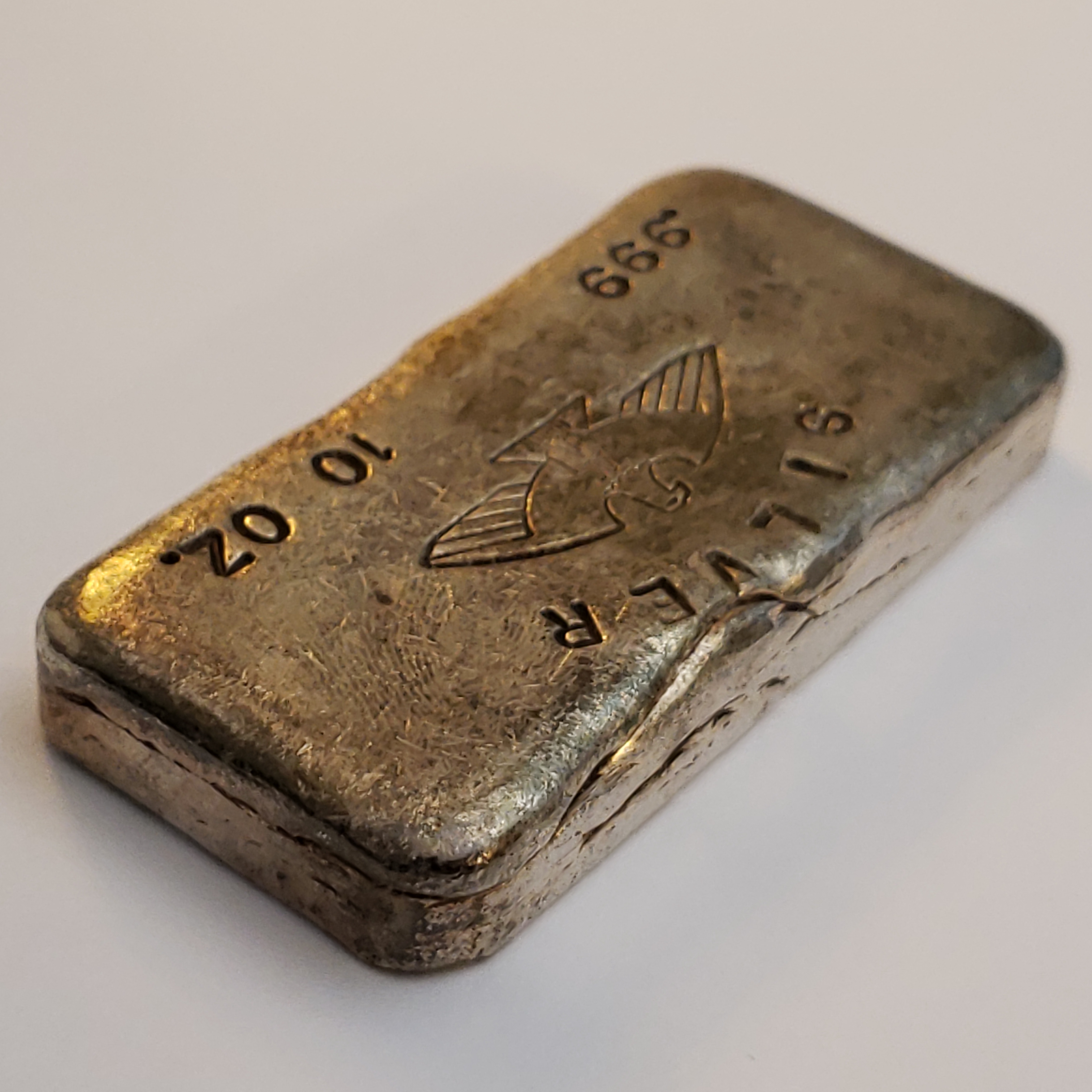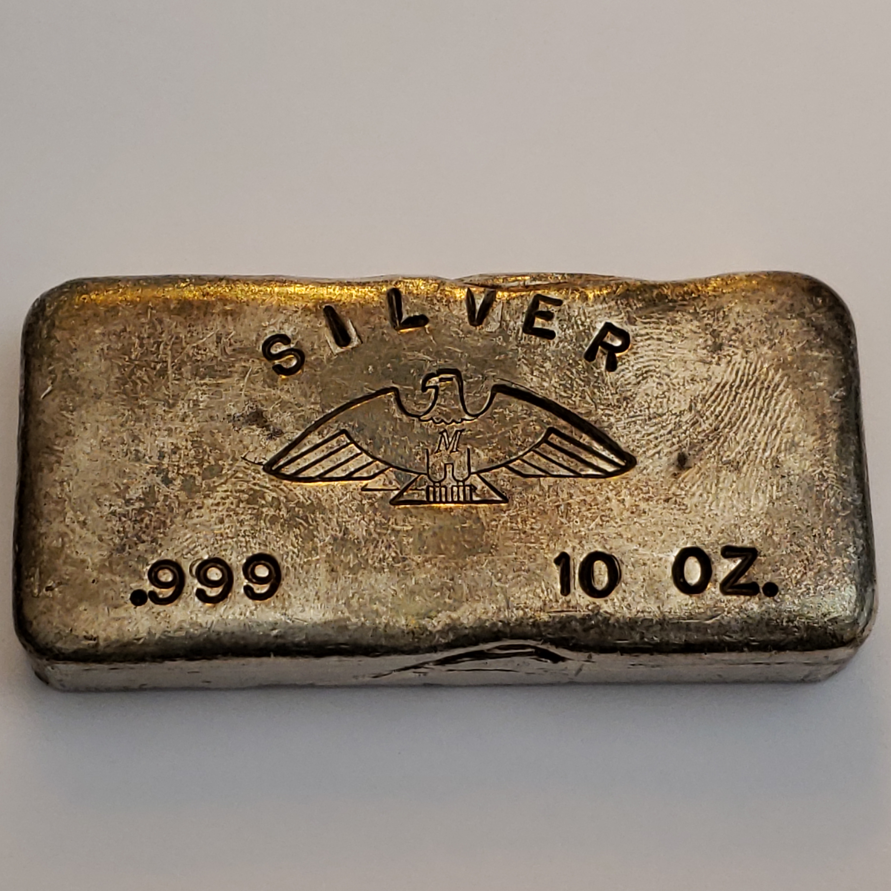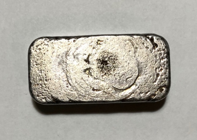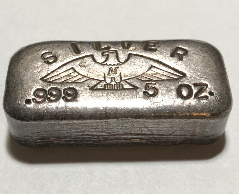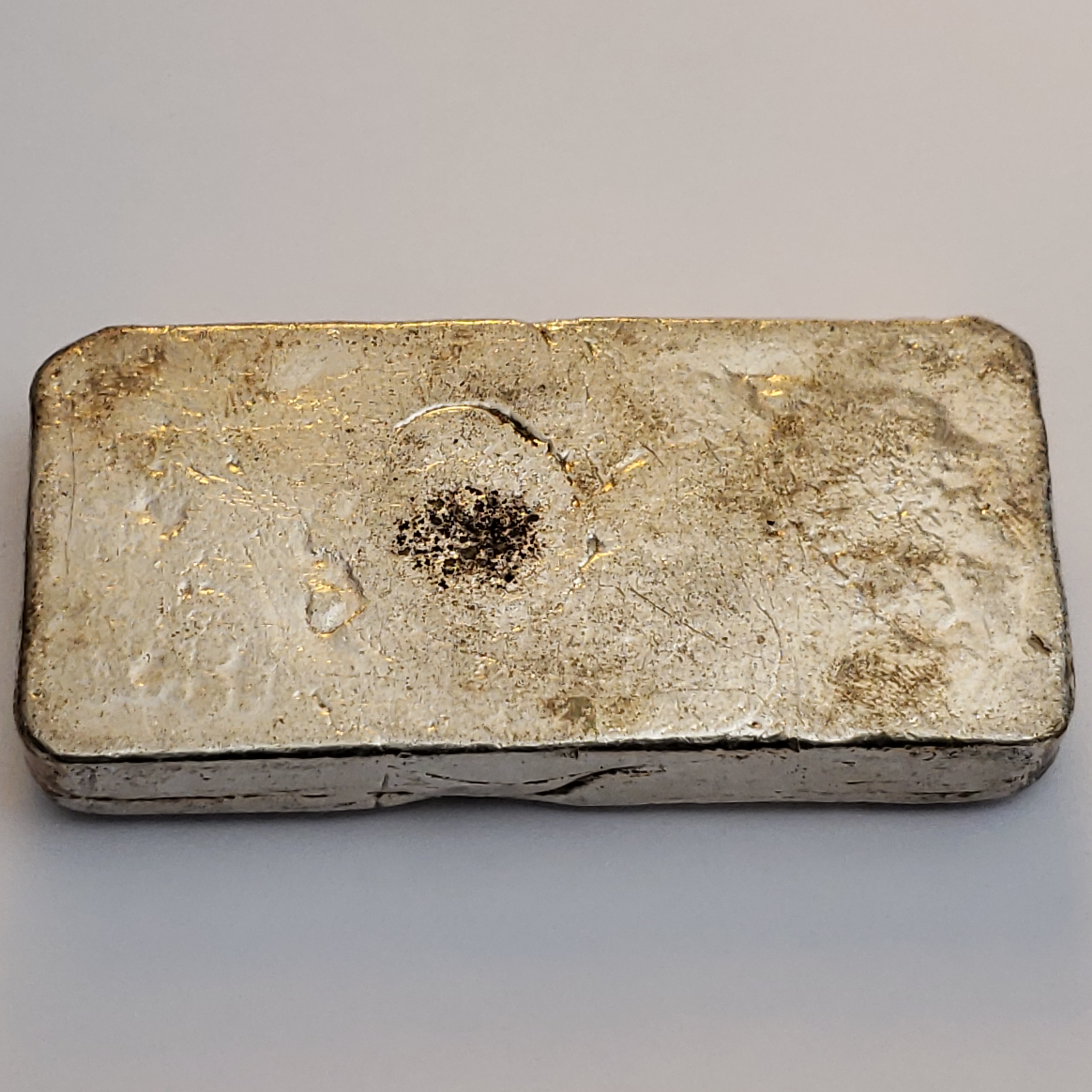 Ingots from this company can be divided into two general types: “Shallow” pour, with an early crude look, and the more “chunky” rectangular pours. Both types have been observed in all the weight classes listed below, except for 2oz and 3oz, which so far as the author knows, have only appeared as the crude, early type. The shallow pours often have a “pillow-top” appearance in the smaller sizes, and are typically more difficult to find. [OPA]