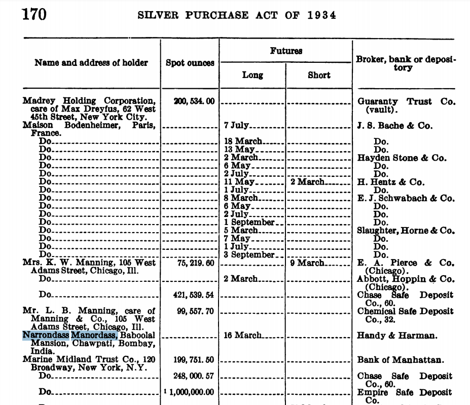 One interesting piece of information is that Handy & Harman, a popular American precious metals company, was a depository for Narrondass Manordass during the early 1900s holding thousands of ounces of silver for them. Here's an excerpt from the Silver Purchase Act of 1934 where this information is listed:
