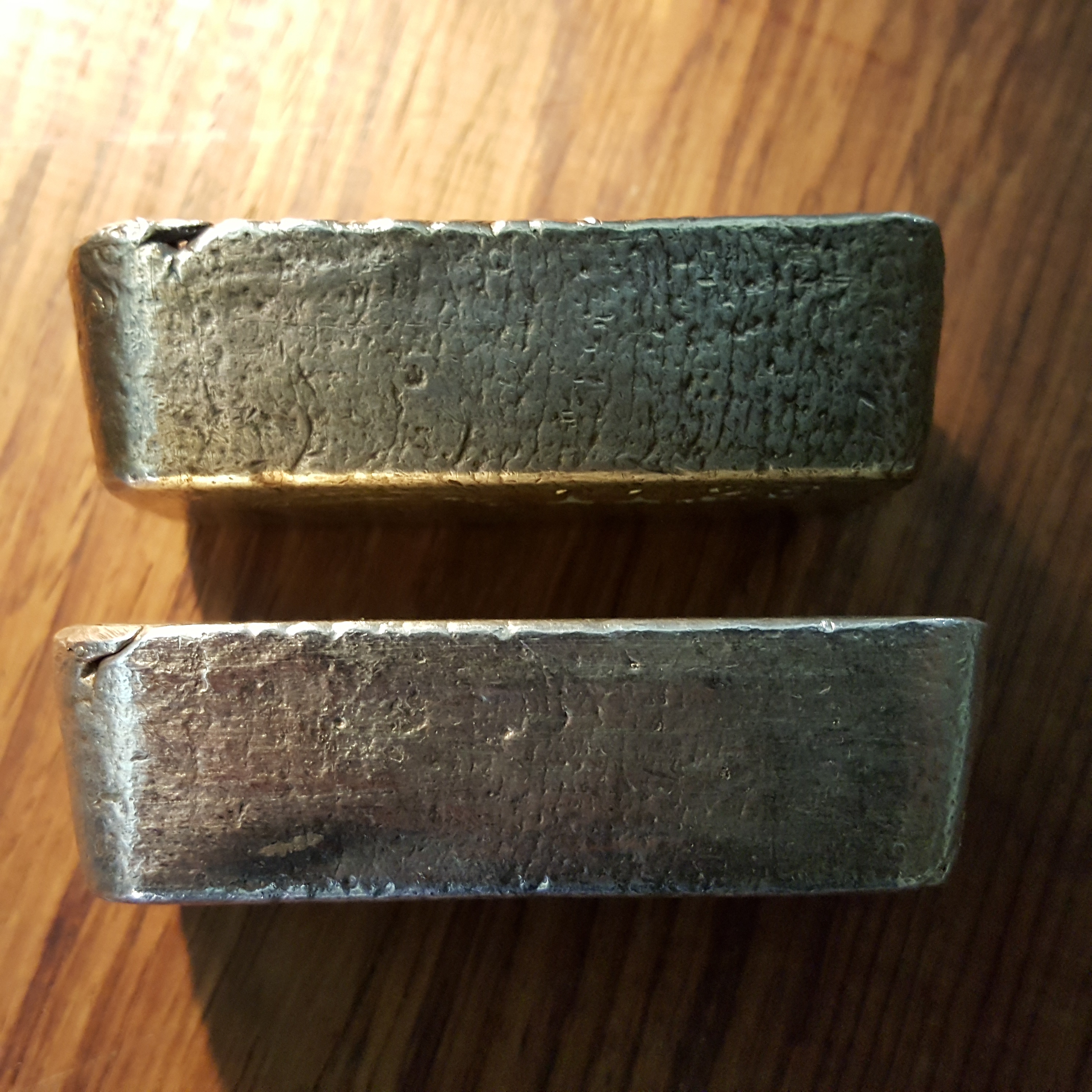Type 1 pours: Display a “chunky” rectangular (technically trapezoidal) shape, with a smaller, 22mm diameter hallmark stamp.