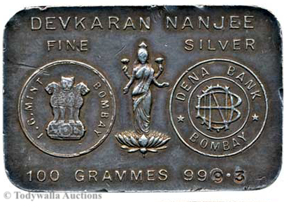 After India's independence in 1947, His Majesty's Mint became India Government Mint (I.G. Mint) so the 5, 10, and 20 Tolas with the I.G. Mint's State Emblem of India and Dena Bank's DNB monogram were probably produced after this year.