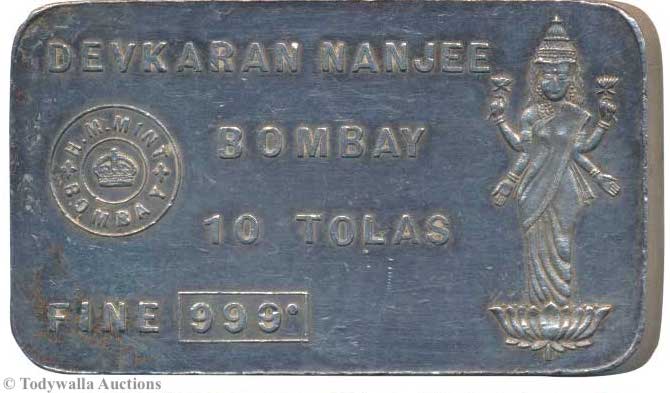 A note on possible years of production: The 5, 10, and 20 Tolas bars by His Majesty's Mint (H.M. Mint), Bombay with the crown logo and Dena Bank's Goddess Lakshmi logo were most probably produced between 1938 and 1947, 1938 being the year in which this bank was established and 1947 is the year when H.M. Mint was renamed.