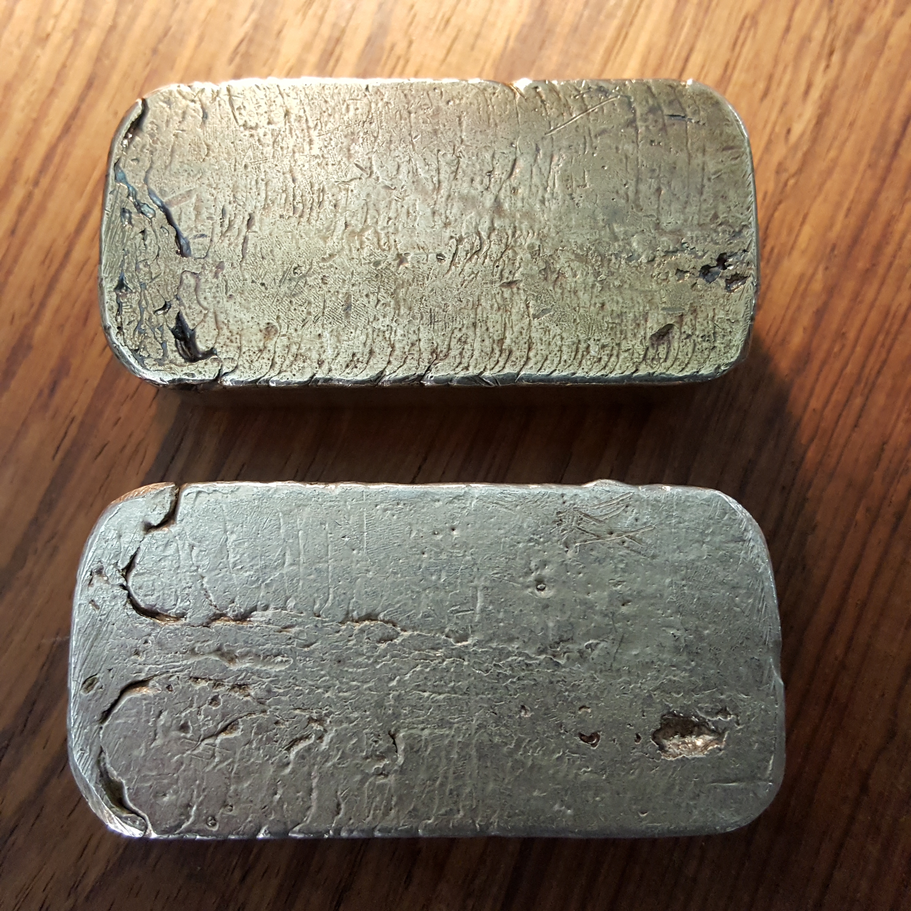 Type 1 pours: Display a “chunky” rectangular (technically trapezoidal) shape, with a smaller, 22mm diameter hallmark stamp.
