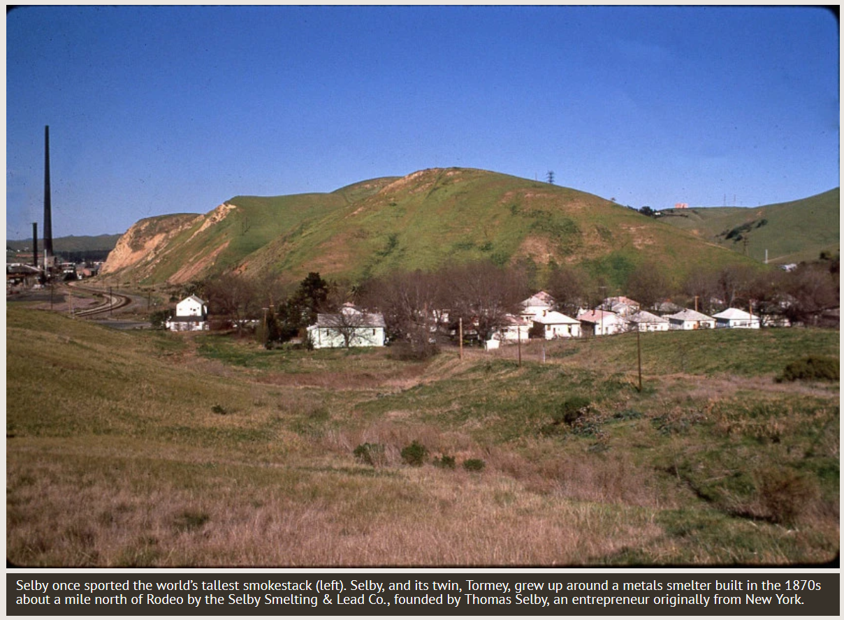 From Tormeyclan.com: “In 1884, under the direction of Prentiss Selby, the Selby Smelting and Refining Co. (often referred to as the Selby Smelting Works, or simply Selby Works) decided to move their huge refining operations from San Francisco to Contra Costa County. The Selby Works (the largest gold, silver and lead refining firm in the Western U.S.) had long been a cornerstone of San Francisco industry. Their growing success, however, also made them an increasingly bad neighbor in the city [due to emissions from the smokestacks].”