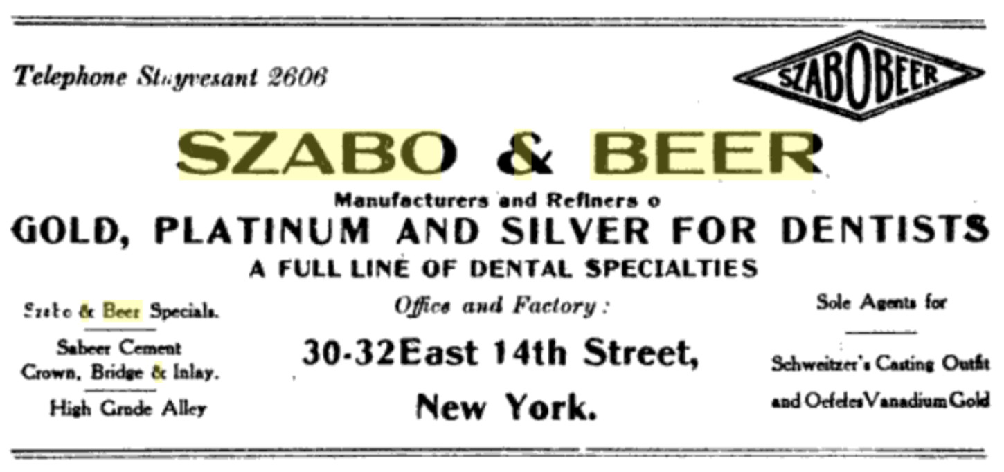 Company Information: Records indicate that Arthur Szabo has been in the precious metals refining and dental businesses as early as 1916. Here's an advertisement from The Stomatologist from March, 1916 published by the New York College of Dentistry: