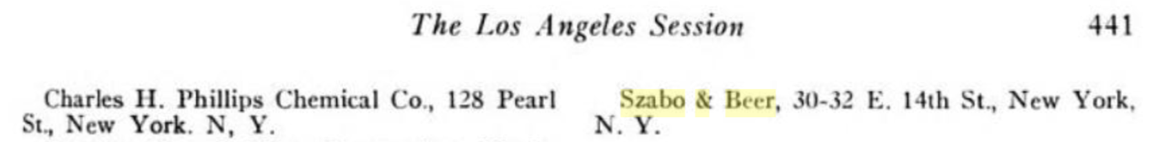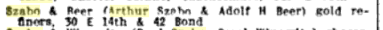 Here's a note from R.L. Polk & Co.'s Copartnership and Corporations Directory of New York from Januaray 1919 mentioning Arthur Szabo & Adolf H. Beer of the Szabo Beer refinery.