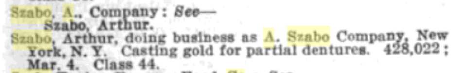 Although the exact year of establishment is not known, A. Szabo Company was formed in New York whose main business is casting gold for partial dentures. Following are a couple of listings from the Index of Trademarks Issued from the United States Patent Office published in 1946 by U.S. Government Printing Office.