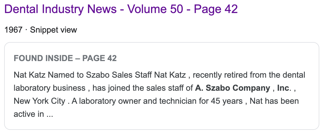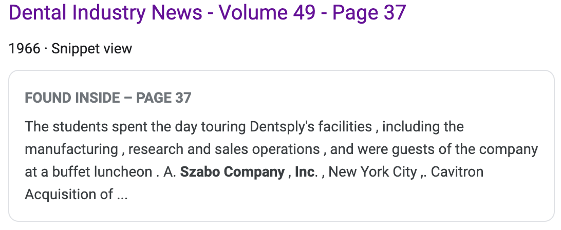A. Szabo Company, Inc., was also mentioned in the 1962, 1966, and 1967 Dental Industry News Volumes 45, 49, and 50 respectively that are published by Modern Medicine Publications.
