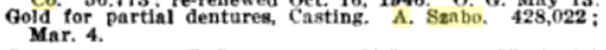 It's not known when Szabo Beer ceased to exist but from the records, it seems like Arthur Szabo continued in the dental business specifically dealing with metal alloys adapted for use in the manufacture of dental castings. Here's one of Arthur Szabo's patents from December 5th, 1939.