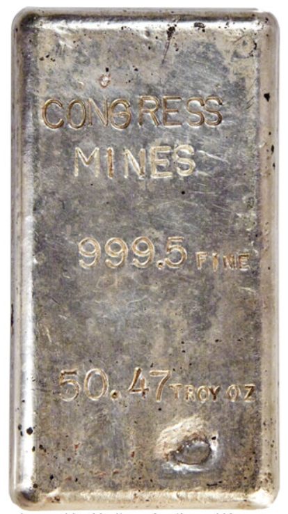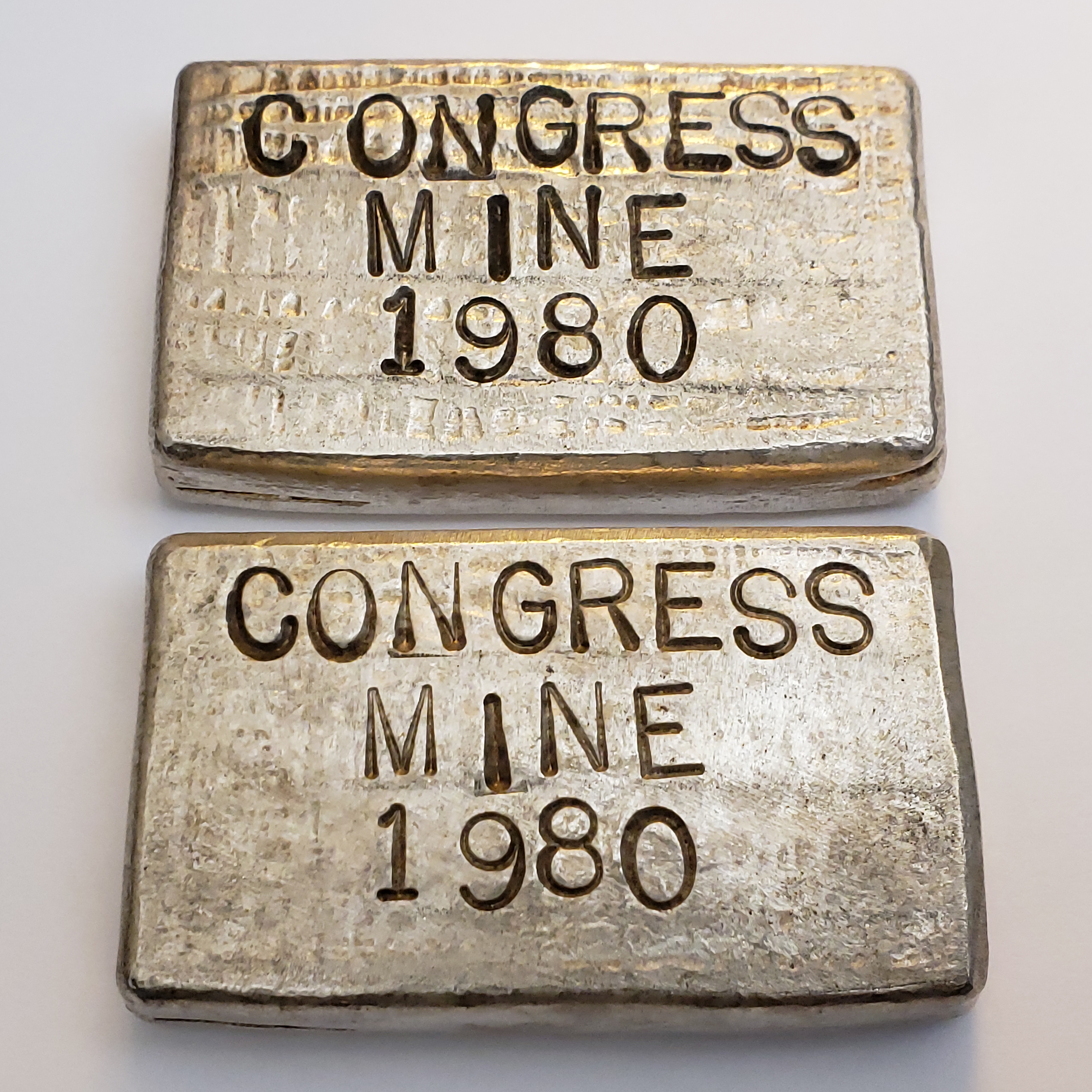 From the above entry, “On March 5, 1980, Ken Phillips, PE wrote in a letter to Salisbury Adams that the Congress Consolidated Gold Mining Company was reworking some of the old dumps and planning to begin mining operations in the future.” From the two 10oz examples shown below, it seems plausible that ore concentrates were sent to Engelhard for refining, sent back in the form of bars, and then counter stamped “Congress Mine 1980” as a marketing tool for investors, or as a type of “proof” of ore quality. Engelhard was quite active in Arizona at the time, and we know they had some type of interest in the Oro Grande Mine, about 10 miles Southeast of the Congress Mine. Interestingly, Engelhard also owned and operated a surface strip mine in Apache County, where they recovered clay soils for use as a clarifying agent in the oil industry.