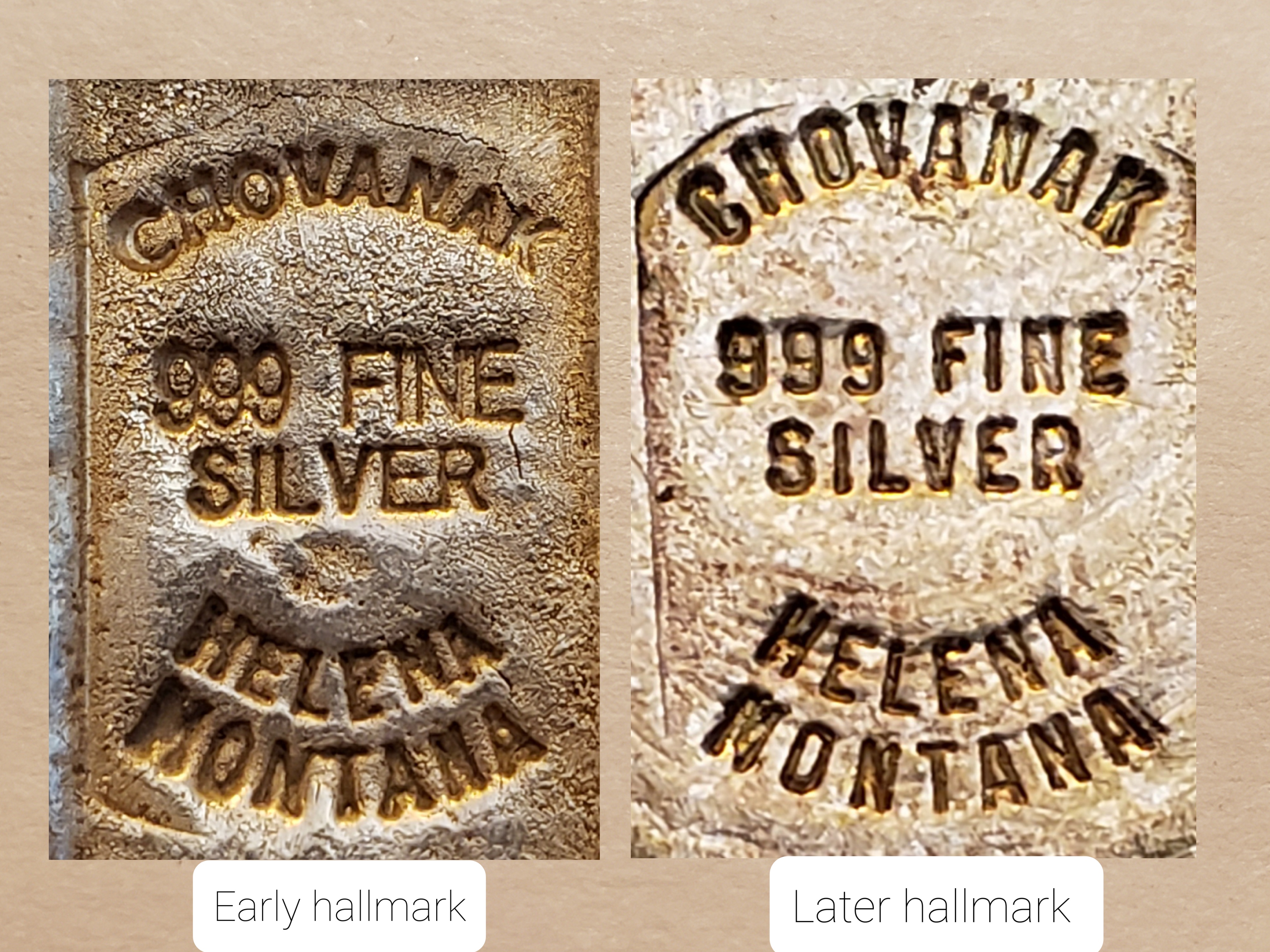 As seen above, the older hallmark is the easiest to recognize by the distinct difference in the “999” font, but in fact, most of the lettering is different as well. The earlier version stamping displays vertically “taller” “999 FINE SILVER”, but vertically “shorter” “Chovanak” fonts. The “Helena Montana” lower portion of the gang stamp remains almost identical, with just minute differences. Compare the letter “O” in Chovanak between the two hallmarks.