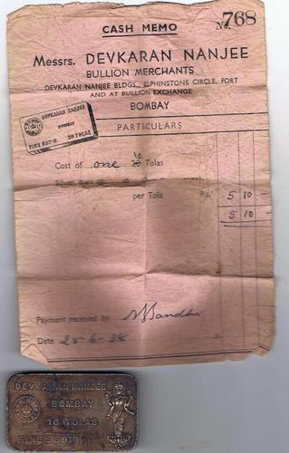 Here's a receipt for a 10 Tolas silver made by H.M. Mint dated June 28, 1938 (28-6-1938):