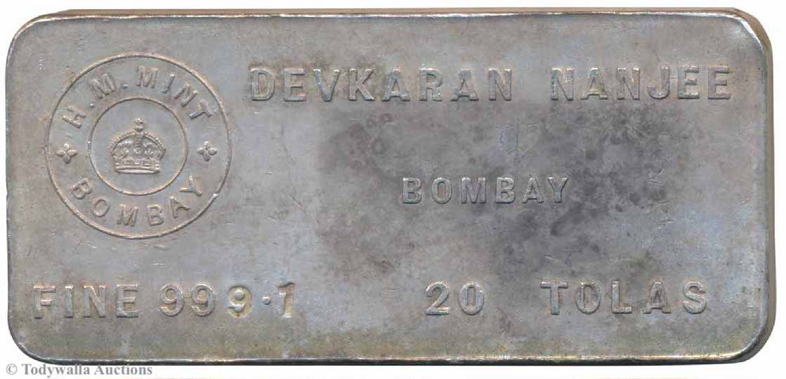 A note on possible years of production: The 5, 10, and 20 Tolas bars by His Majesty's Mint (H.M. Mint), Bombay with the crown logo and Dena Bank's Goddess Lakshmi logo were most probably produced between 1938 and 1947, 1938 being the year in which this bank was established and 1947 is the year when H.M. Mint was renamed.