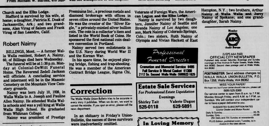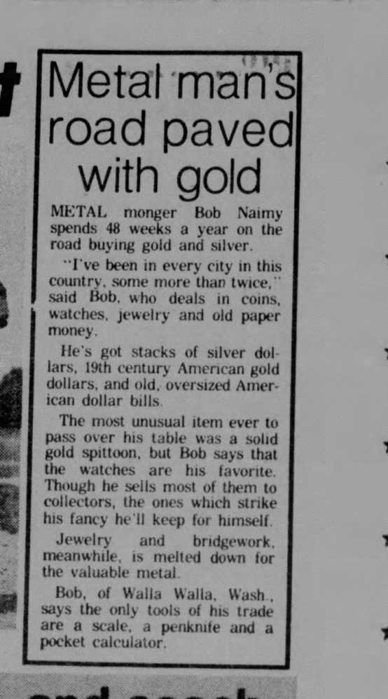 Robert (Bob) A. Naimy was born in July 1926 and died in October of 1986. He married in 1950 and had several children who in later years helped him with his traveling business buying coins, precious metals and other valuables. He spent most of his life in Walla Walla, Washington, divorced in 1976 and moved to San Diego around 1979.