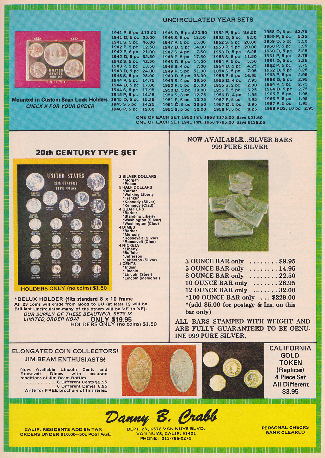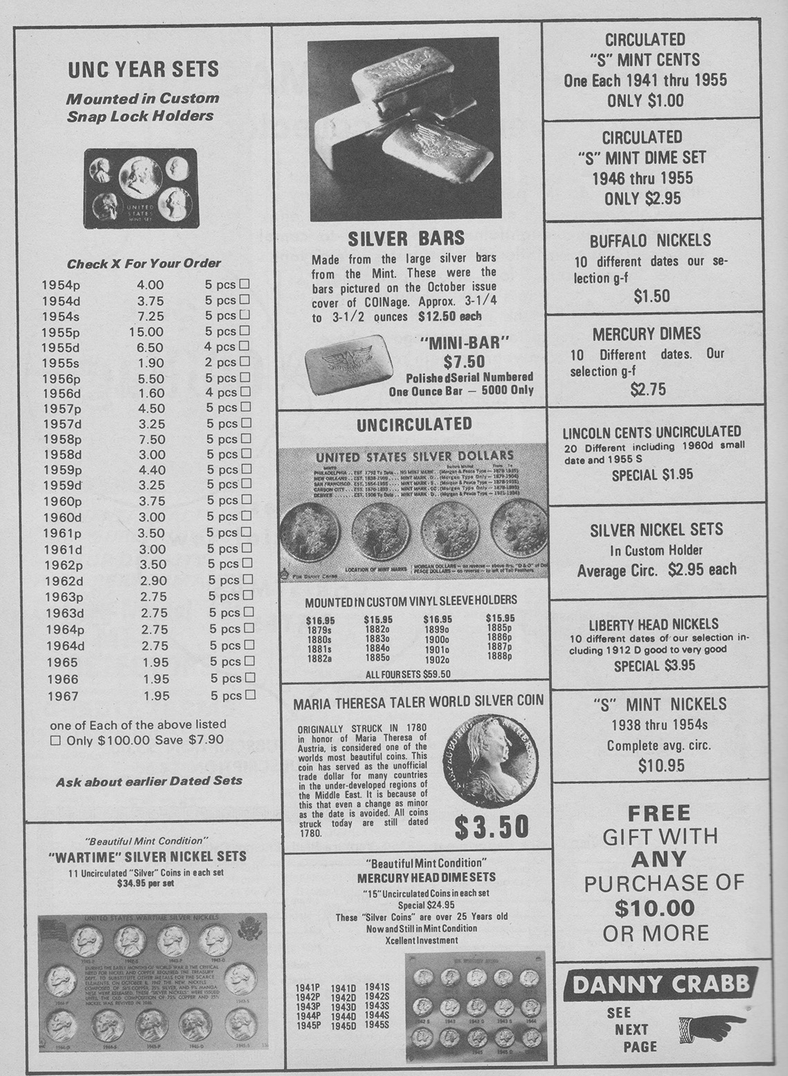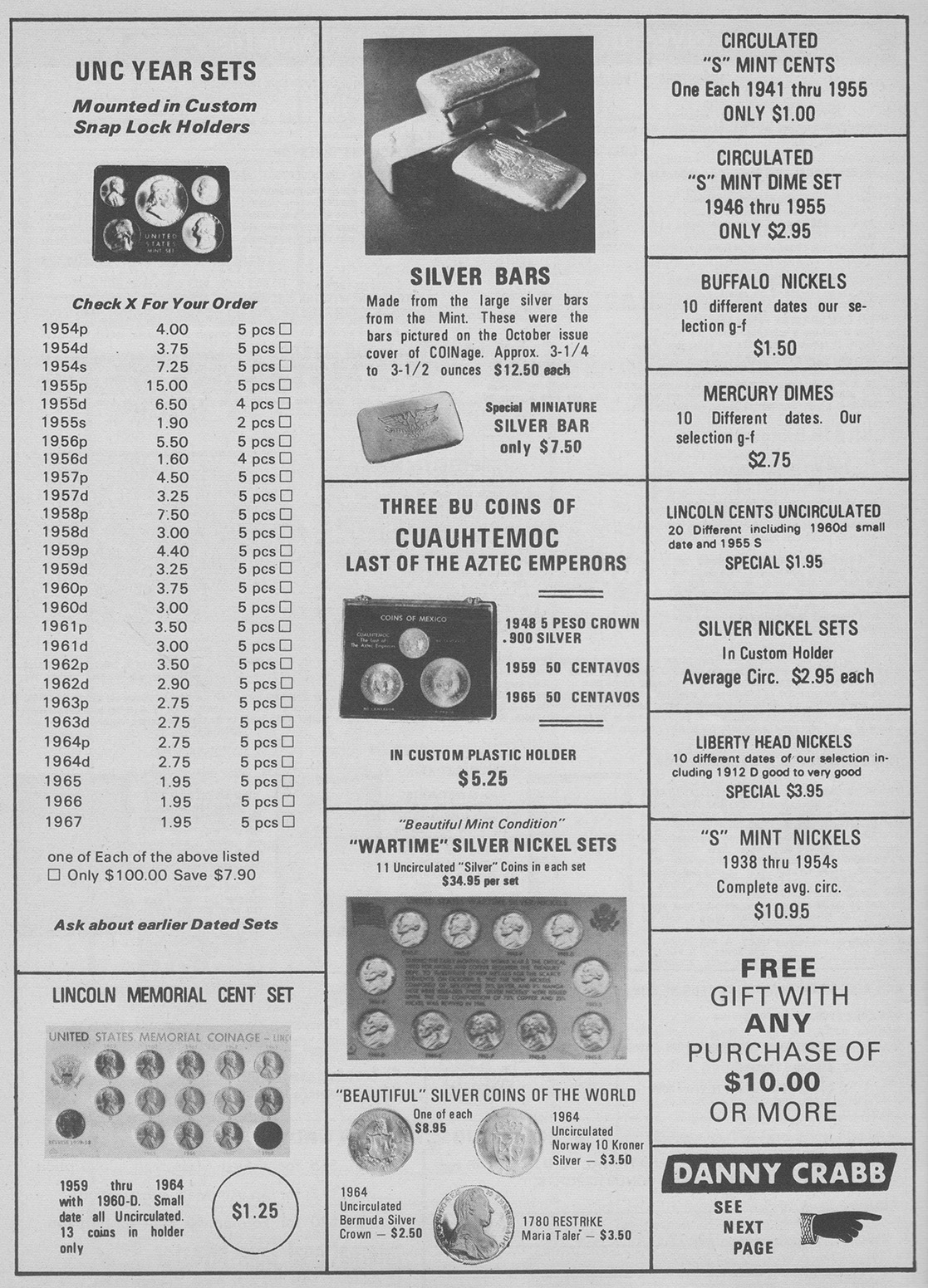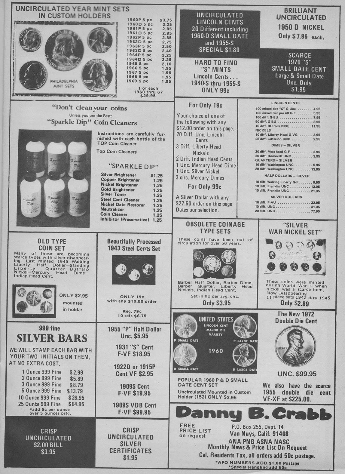 From my research, the first instance a poured bar appeared was October, 1967 in Coinage Magazine. All these other ads are from Coinage magazine which I have about 50 from 1967-1981 I have not been able to look at Coin World archives and only have four Coins magazines from this era with no ads showing poured bars. Initially, Danny B. Crabb was the main supplier of these bars.