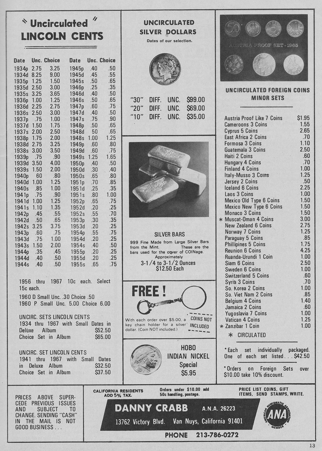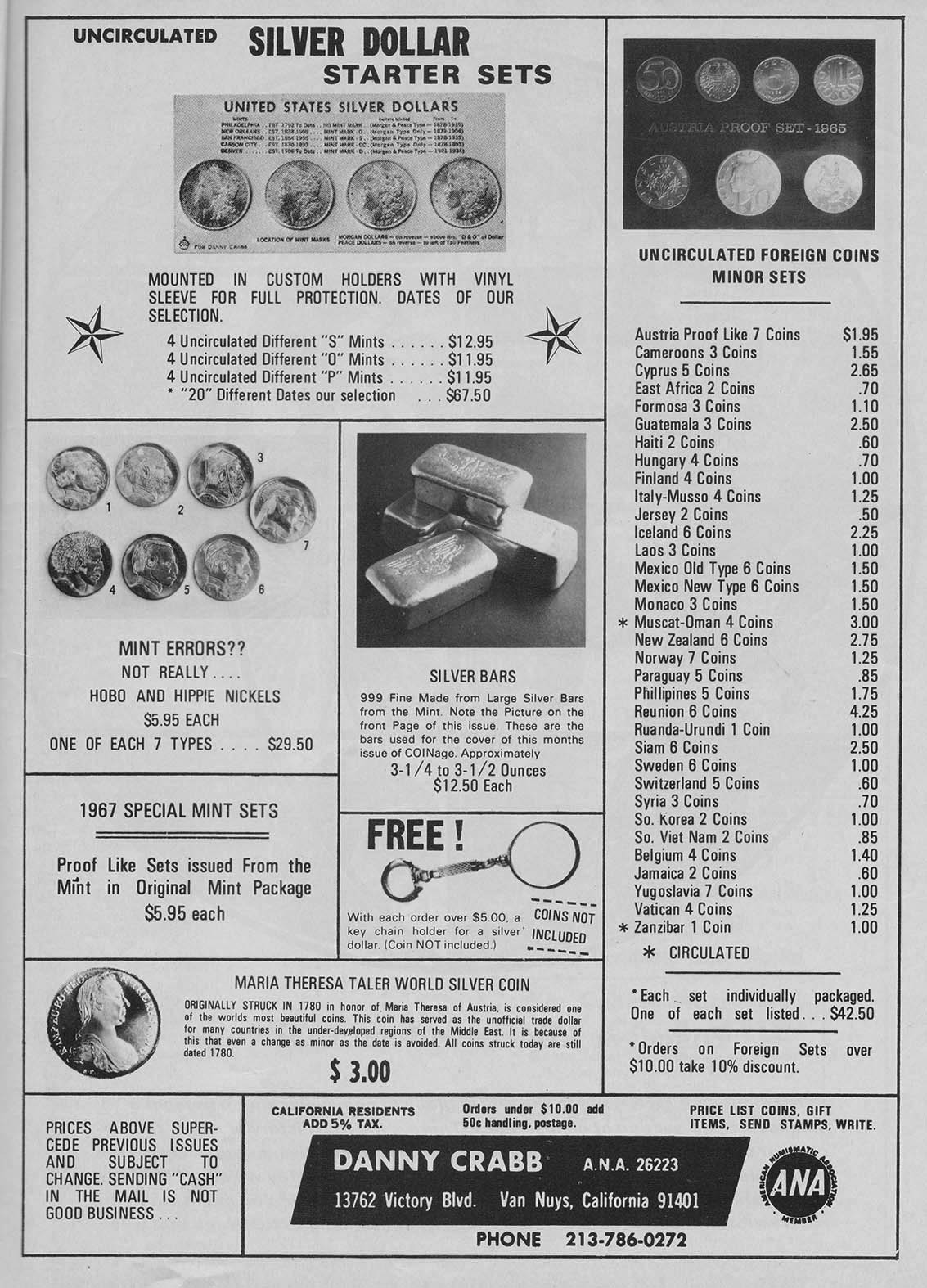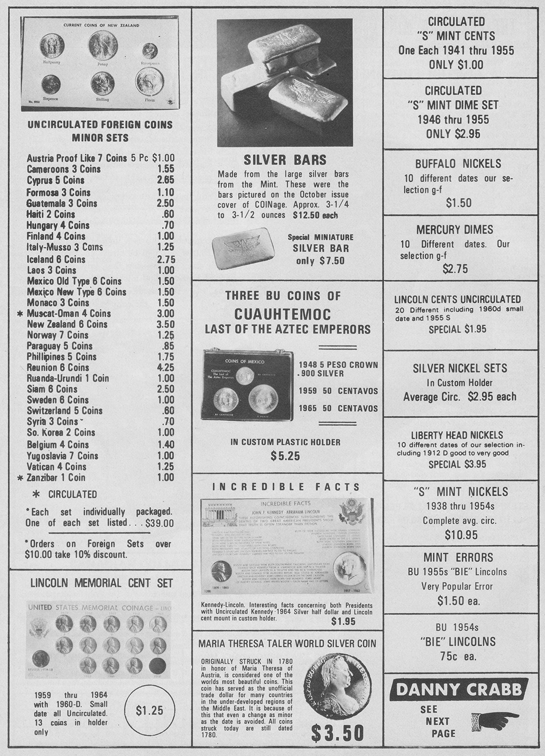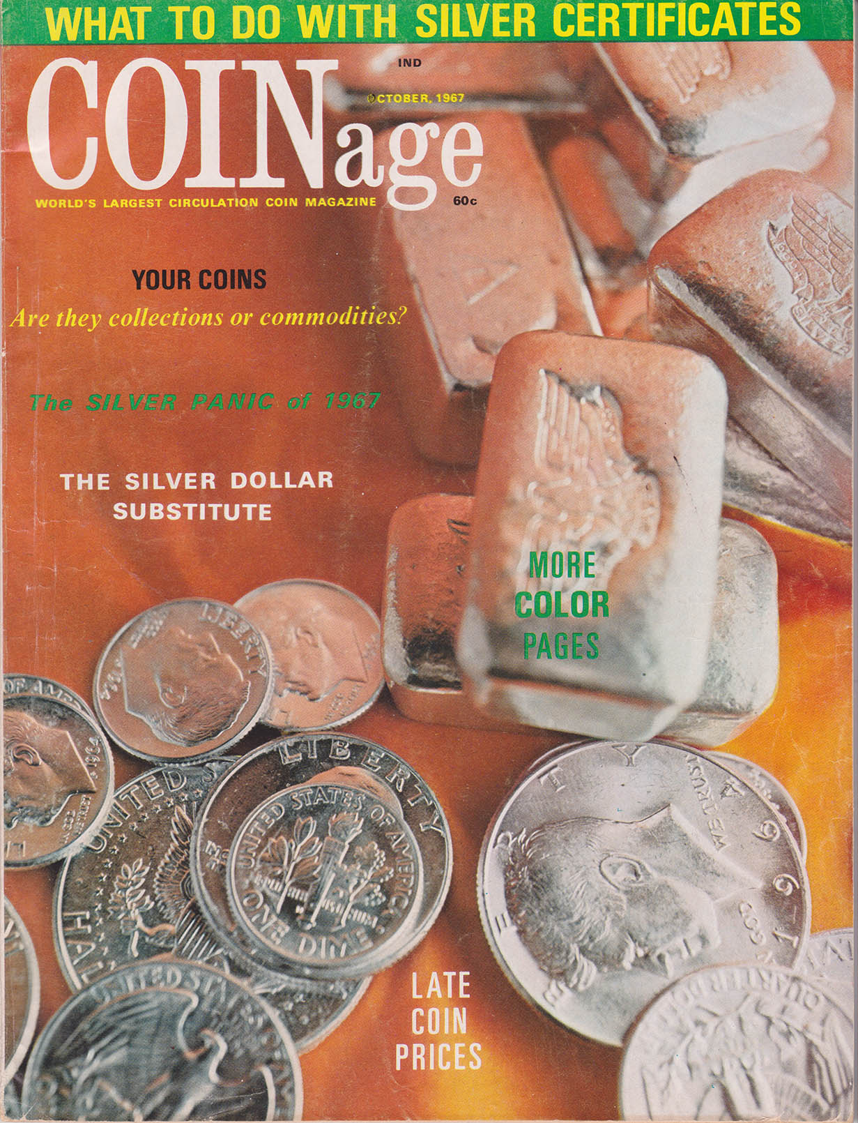 From my research, the first instance a poured bar appeared was October, 1967 in Coinage Magazine. All these other ads are from Coinage magazine which I have about 50 from 1967-1981 I have not been able to look at Coin World archives and only have four Coins magazines from this era with no ads showing poured bars. Initially, Danny B. Crabb was the main supplier of these bars.