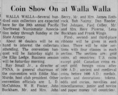 A May 24th, 1964 article mentioned that William Foster paid $6695 for a coin along with someone from Denver and that he was associated with the Walla Walla Coin Co.: