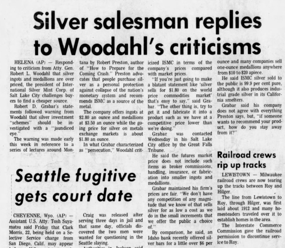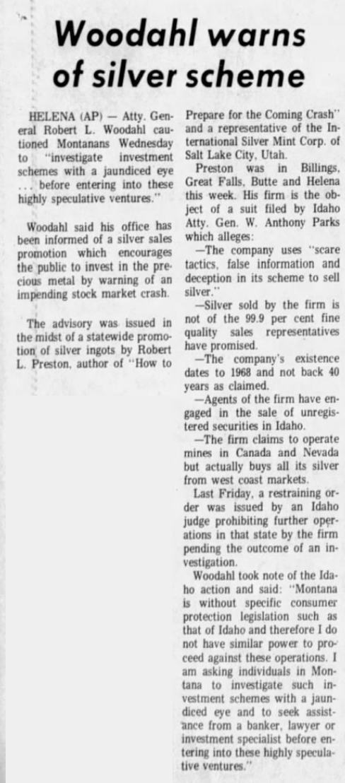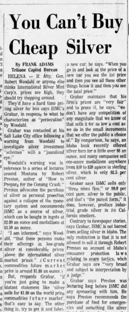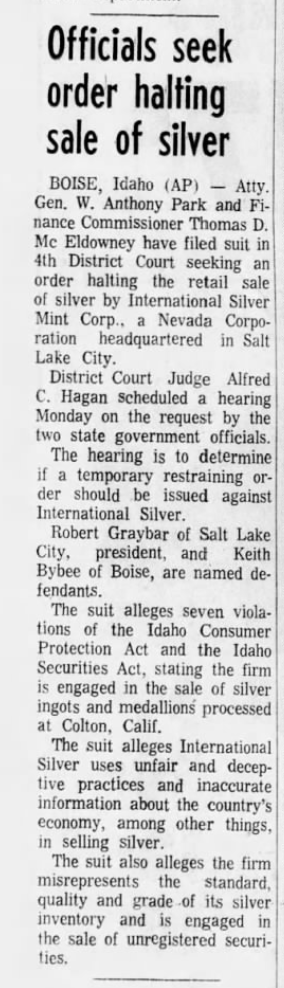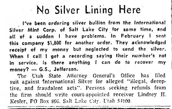 International Silver Mint Corporation ran several advertisements in 1972. From the Daily Herald, Provo, Utah from January 23, 1972: