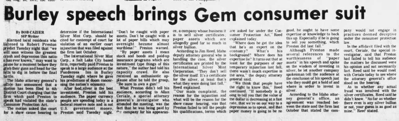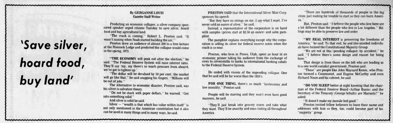 They also sponsored various presentations and sales events hosted by Robert Preston, a doom and gloom author. This example is from the Odgen Standard-Examiner on March 19, 1972: