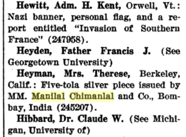 Here's a note from The United States National Museum: The Annual Report for the Year Ended June 30, 1963 showing the donation of a 5 Tola Manilal Chimanlal Silver piece made to the national collections.
